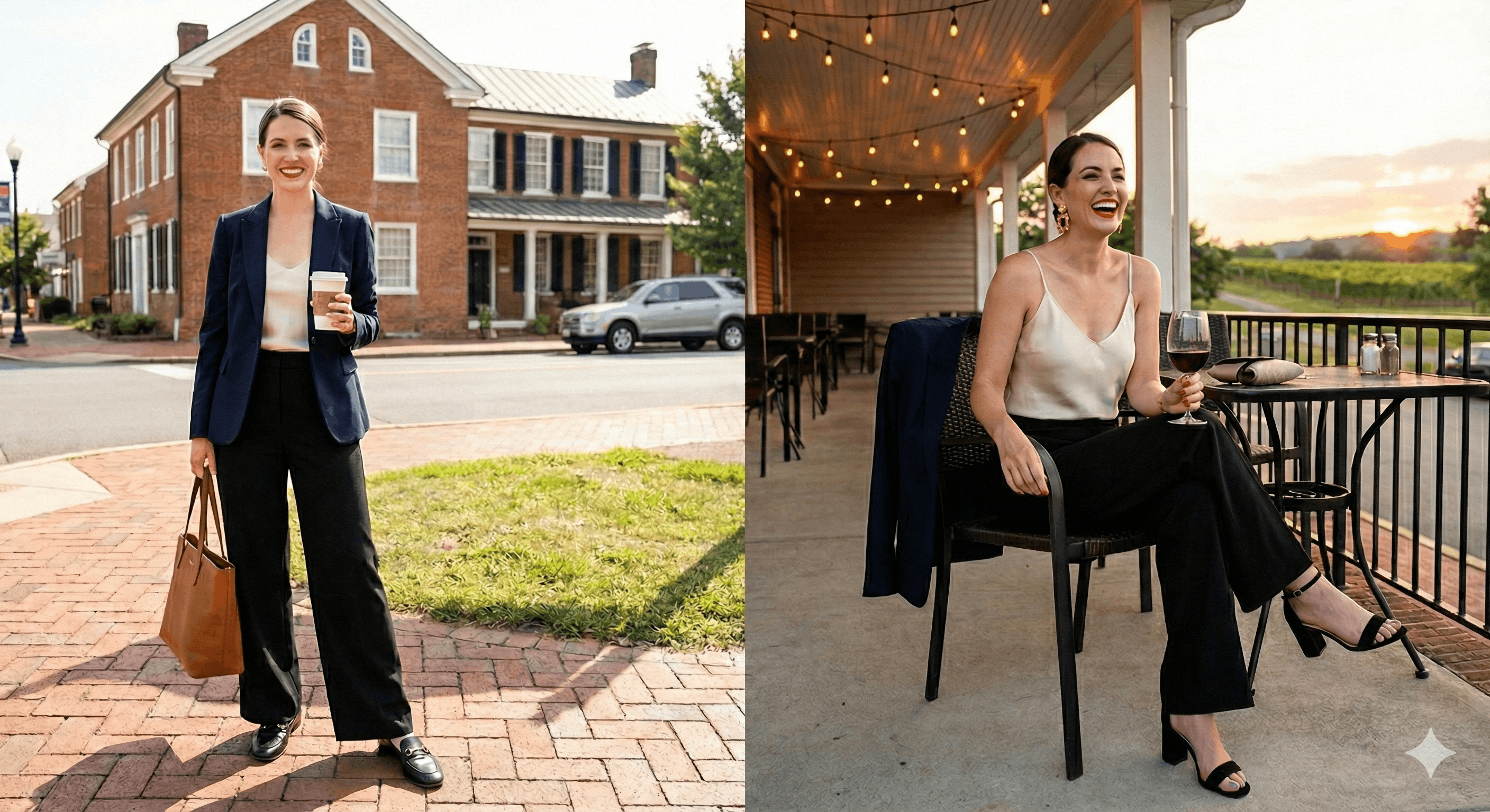 When planning a day-to-night look for a day in Culpeper, I encourage you to think in terms of subtraction rather than addition. It is always easier to remove a layer or swap an accessory than it is to build a new look from scratch.